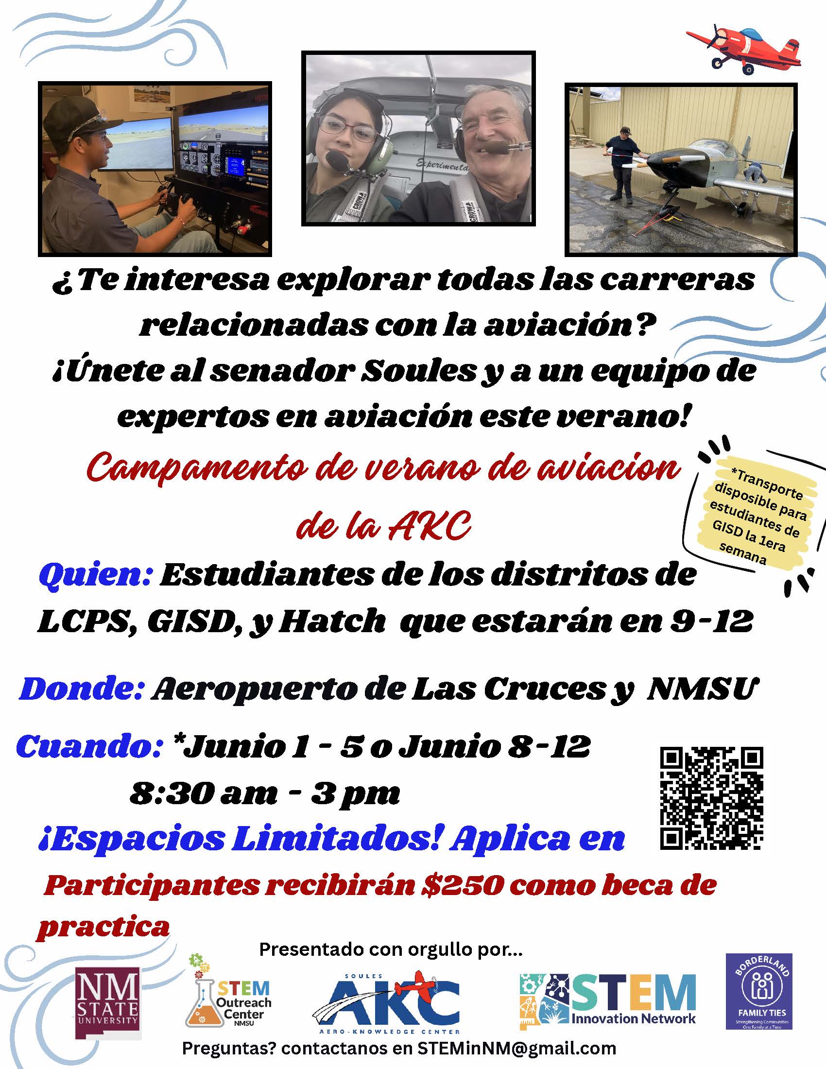 Los estudiantes tendrán la oportunidad de explorar carreras en aviación y aprender de profesionales en el campo. Los participantes también recibirán una beca de práctica de $250. El espacio es limitado y se recomienda que los estudiantes interesados soliciten lo antes posible.