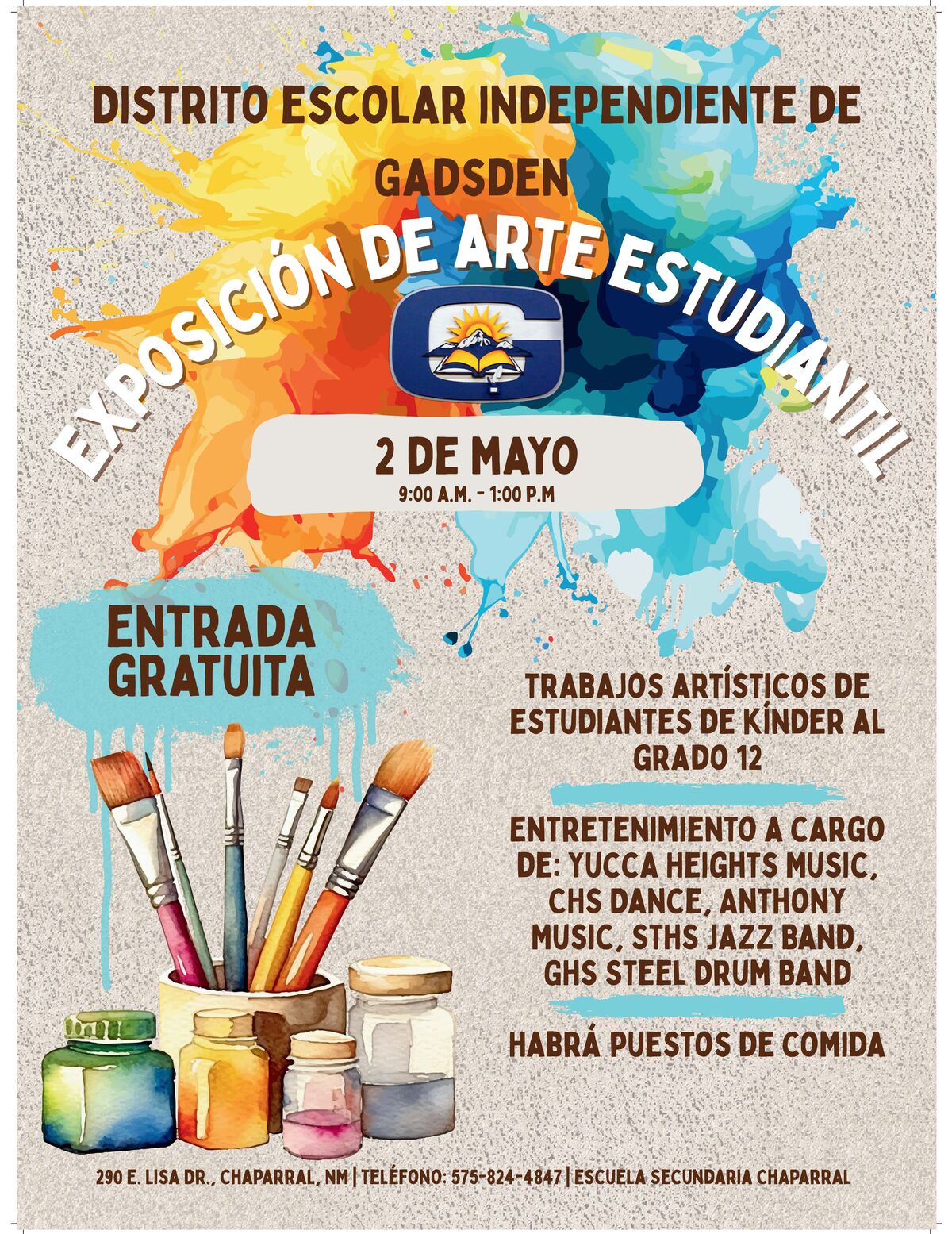 Gadsden Independent School District invites families, staff, and community members to attend the Student Art Show on Saturday, May 2, 2026, from 9:00 AM to 1:00 PM at Chaparral Middle School, located at 290 E. Lisa Dr., Chaparral, NM.